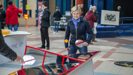 The room was a hive of activity from the off. Our aptly named ‘Constellation’ table saw participants attempt to beat their opponent whilst avoiding the imaginary stars. ‘Sunbeam’ stunned players with a pulsating orange glow from the table, as well as from the specially adapted bats and balls. And, last but not least, our ‘Skew-V’ table’s diagonal stripes and slanted playing surface served to beguile and bewilder the masses.